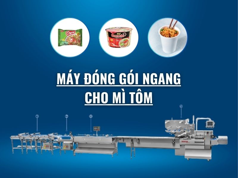 Máy đóng gói mì ăn liền thường được trang bị hệ thống cắt, gấp túi, dán mép và in date tự động, giúp tăng năng suất và giảm phụ thuộc vào nhân công.