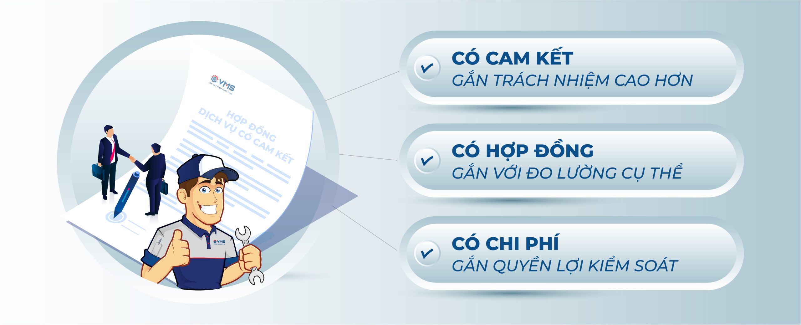 “Dịch vụ miễn phí là lời hứa thiện chí. Dịch vụ có cam kết là sự đảm bảo bằng hành động.” VMS tin rằng chất lượng thật sự phải có cam kết, đo lường và trách nhiệm. Bằng hợp đồng dịch vụ minh bạch, chúng tôi không chỉ cung cấp dịch vụ kỹ thuật chuyên nghiệp, mà cung cấp niềm tin vận hành bền vững cho khách hàng.