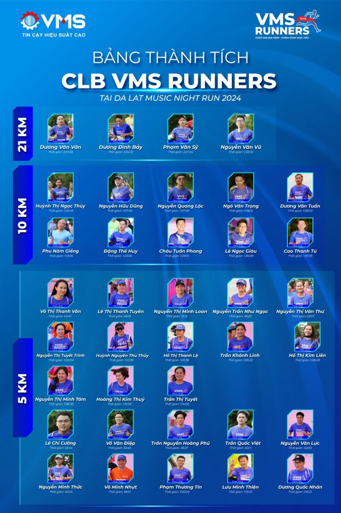 Đà Lạt Music Night Run 2024 đã để lại những trải nghiệm thể thao đầy thú vị và giây phút khó quên. Chúng tôi, những thành viên của đại gia đình VMS, rất tự hào khi đã tham gia và hy vọng sẽ tiếp tục đồng hành cùng những sự kiện ý nghĩa như thế này trong tương lai.