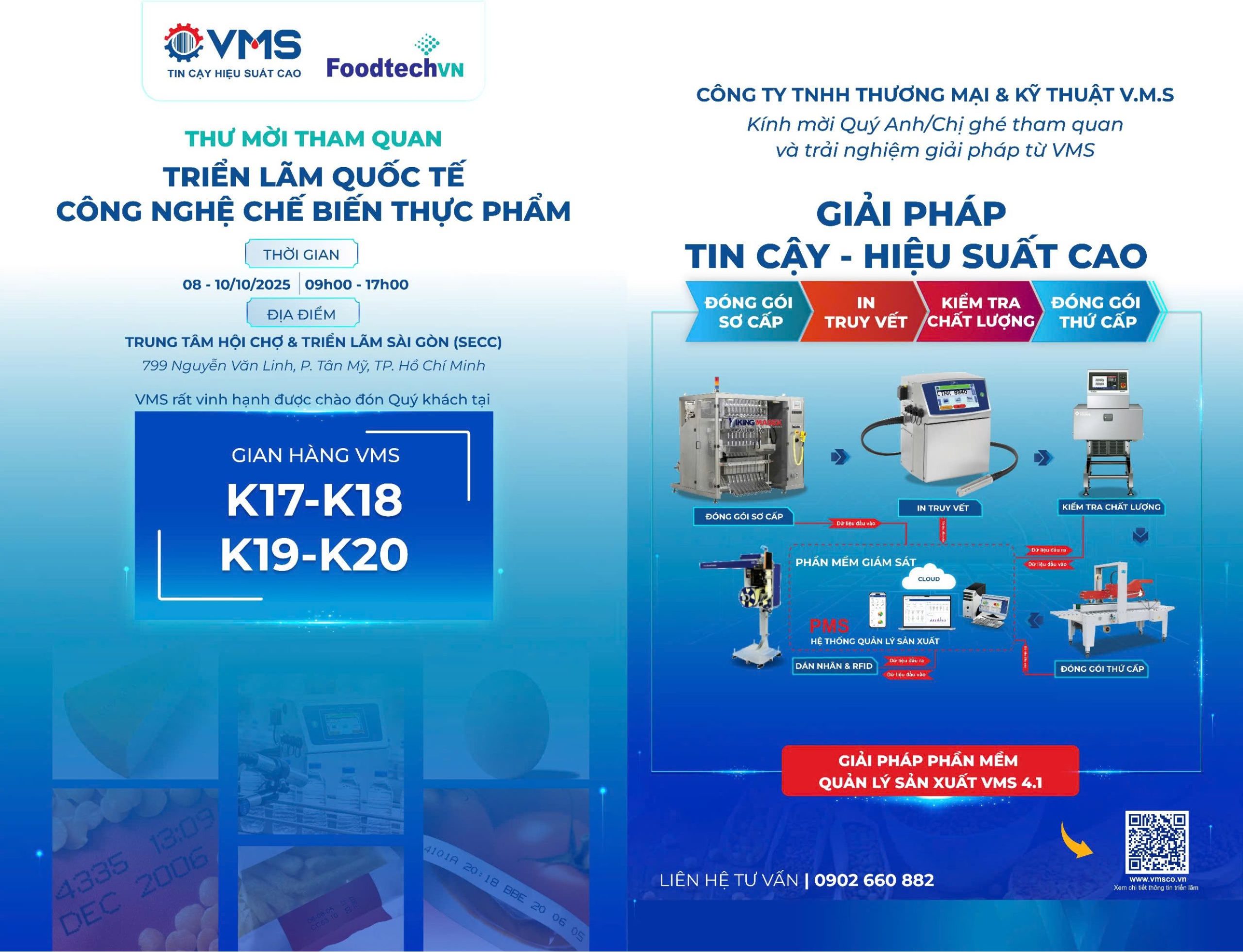 Triển lãm quy tụ các giải pháp, công nghệ hiện đại trong lĩnh vực thực phẩm đang phát triển mạnh. Tại gian hàng K17-K18-K19-K20, VMS giới thiệu giải pháp TIN CẬY – HIỆU SUẤT CAO giúp cho doanh nghiệp số hoá trong sản xuất.